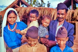 सुर्खेतमा आफ्नै घर अगाडि श्रीमती, काखमा छोरा श्यामलाल, सानो छोरा तिर्थबहादुर, दलवीर तथा अगाडि आफन्त छोराहरु
