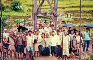 रावतकोटको छमघाट खोलाको झोलुङ्गे पुल उद्घाटनको सामुहिक तस्बिर, बायाँपट्टी छाता बोकेर पुलसँगै उभिएका दलवीर सिंह ।
